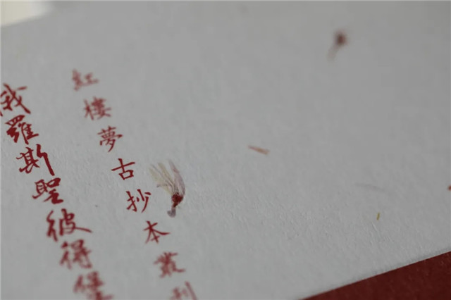 “紅樓夢古抄本叢刊”除了對底本高清掃描影印,每一種都邀請紅學專家撰寫前言,如石昌渝、張慶善、胡文彬、杜春耕、任曉輝等,為大眾讀者深入淺出地介紹相關版本流傳情況和學術價值。此外,這套書的裝幀設計獨具匠心,頗受好評。設計者劉靜老師介紹,在封面設計前專門和特種紙生產商合作,在普通膠版紙紙漿中加入適量藏紅花,經過幾次試驗,得到目前大家看到的白色藏紅花特種紙。精裝紙板第一層裱白色藏紅花紙。在封面下方2/3處加裱一層土紅色里紙。書名字分兩部分,上半部分文字專色紅色印在白色藏紅花紙上,下半部文字和版本信息在土紅色里紙上燙印白色漆片。