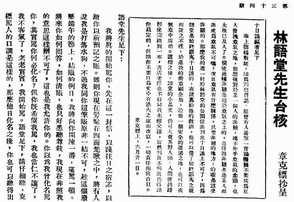 《林語堂先生臺核》,1934年