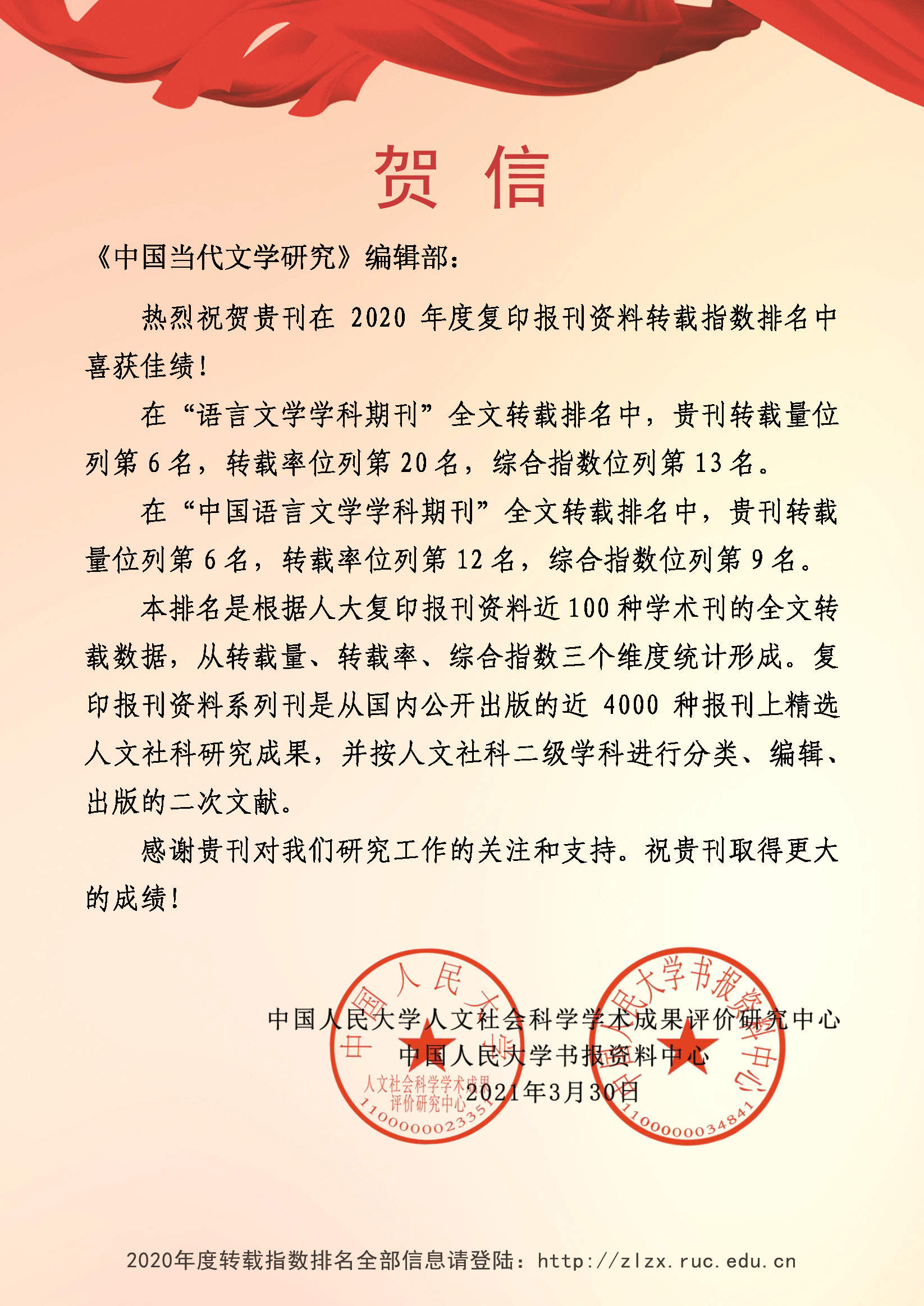 2021年3月30日,中國人民大學人文社會科學學術成果評價研究中心和中國人民大學書報資料中心發布了2020年度復印報刊資料轉載指數排名,《中國當代文學研究》喜獲佳績。在“中國語言文學學科期刊”全文轉載排名中,轉載量位列第6名,轉載率位列第12名,綜合指數位列第9名。在“語言文學學科期刊”全文轉載排名中,轉載量位列第6名,轉載率位列第20名,綜合指數位列第13名。