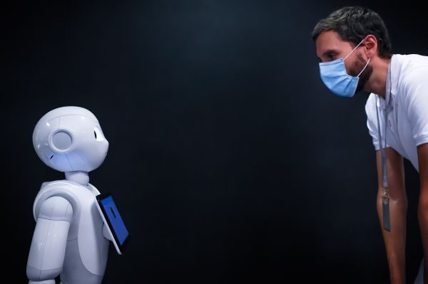 2020年9月10日,在法國巴黎的軟銀機器人公司,機器人Pepper展示檢測人們是否正確佩戴口罩的功能。軟銀機器人Pepper通過自帶的攝像頭掃描人臉,檢測對方有沒有佩戴口罩,并給予禮貌提醒和指導。新華社發(奧雷利安·莫里薩爾攝)