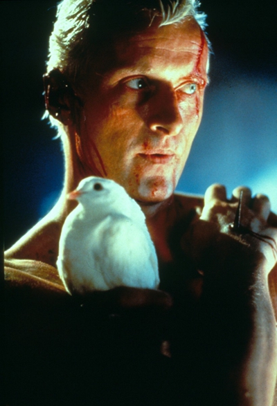 對比1982年的另一部科幻經典《銀翼殺手》,主角戴克奉命獵殺復制人。在這里,身為人類的戴克反而成為執行命令的冷血殺手,被追殺的復制人則擁有類似或高于人類的情感與智慧。電影中最崇高也最悲劇的一幕,即復制人里昂在臨死前的那段獨白——“我所見過的事物你們人類絕對無法置信。我目睹戰艦在獵戶星座的邊緣燃燒,我看著C射線在唐懷瑟之門附近的黑暗處閃耀。所有這些時刻終將流失,一如眼淚消失在雨中。死亡的時刻到了?!彪S后他放飛白鴿,在雨中垂下頭顱。雖然肉體死去,他對未知宇宙的描繪和自我對時間、死亡的獨特感知卻足以震懾人類。