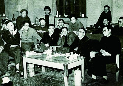 《茶館》的排演場上,老舍先生給大家讀劇本。前排從右至左:焦菊隱、老舍、夏淳、英若誠、于是之。