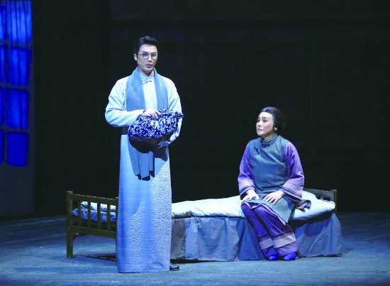 作品選擇葛健豪傳奇一生作為主線時,將重點放在了人物奇與剛的建設上。奇說的是經歷,剛指向的是性格。兩者的結合構成人物與眾不同的戲劇行為?!皵y兒帶女千里行,來到上海尋夫君?!贝竽焕_,從湖南老家千里迢迢趕來上海尋夫的葛健豪,看到屋內游手好閑、吸食鴉片、金屋藏嬌的丈夫時,異常憤怒,忍無可忍,羞憤之下,毅然休夫。在夫為妻綱、出嫁從夫的上世紀之初,這一舉動無異于一聲驚雷在亂世炸響。緊接著又有一串驚雷響起,回鄉之后,當丈夫以500塊大洋將13歲的小女兒蔡暢賣給老翁時,她決然帶著孩子遠走長沙,并將兒女送進學堂,自己也以50歲年紀報名上學,當眾改名葛健豪,立誓要健壯豪放。學校拒絕接收時她毫不退縮,最終被破格與兒孫三代一起同窗就學?!八览锾由酱说?,誓做一回大寫的人”。葛健豪當時的入學,打破了全國所有學堂的先例,無任何一個女人如她這般奇崛?!赌赣H》對葛健豪性格和經歷的構建,簡潔明快、峰回路轉。她堅毅果敢、自立自強,敢于向命運挑戰的性格和勇氣,在休夫、入學兩場戲中,被營造得充滿戲劇意味,成為令人印象深刻的戲劇瞬間。