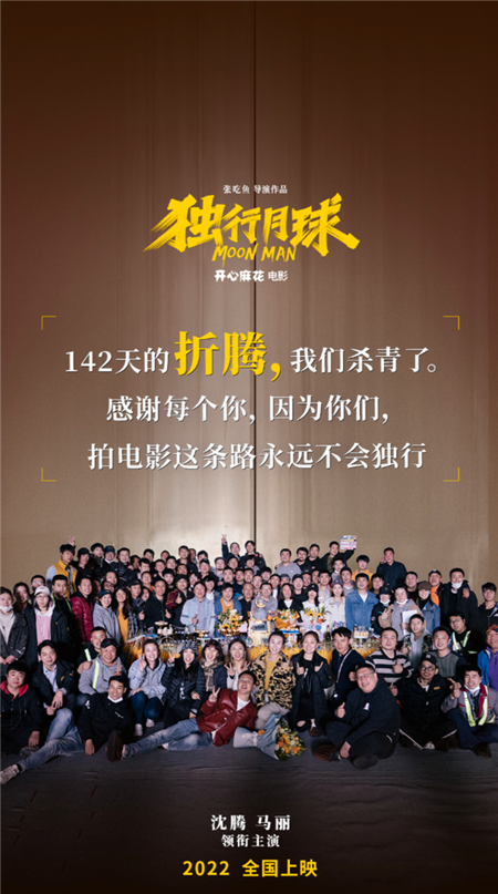 由張吃魚導演,沈騰、馬麗領銜主演的科幻喜劇《獨行月球》,歷時142天拍攝后,今日電影終于宣布殺青,并發布了一組特別的殺青圖,用“騰式文學”花樣展現沈騰的月球漂流記,影片將于2022年全國上映。