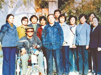 上世紀八十年代初,史鐵生(前坐者) 與同學看望王玉田(前排右五)、 董玉英(前排右四)老師