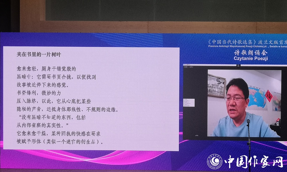 在詩歌朗誦會環節,吉狄馬加深情朗誦了新近創作的長詩《裂開的星球》(節選),表達出對人類生存環境與未來命運的深切思考,引起現場觀眾共鳴。湯養宗、胡弦、陳先發、張執浩等中國詩人和李周、卡塔基娜·薩雷克等波蘭譯者分別用漢語和波蘭語,在現場和線上朗誦了《在漢詩中國》《平安夜》《夾在書里的一片樹葉》《琥珀里的昆蟲》《晚星》《古老的信封》《被詞語找到的人》等入選本詩集的作品。詩人和譯者的精彩演繹引發陣陣掌聲,現場觀眾在漢語和波蘭語的音律之美中穿行,領略了詩歌跨越語言的獨特魅力。