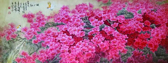 這種高雅與風華,在畫面上表現突出得當,整幅畫是令人愉悅的,花瓣分明的刻畫,紅而不妖,紅而不艷,紅而不俗。畫面疏密、濃淡、主次,妥帖到位,充滿動感,映山紅爭相競放,那份生動蓬勃、盎然生氣,十分感人。而畫中鳥的穿插,亦不是可有可無的,進一步增加動感。山水的偶然崢嶸,也使畫面更為豐富,深化了作品的意境。透過畫面,我們能夠深切地感受到陳奕純內心對中國共產黨無限的敬仰之情。