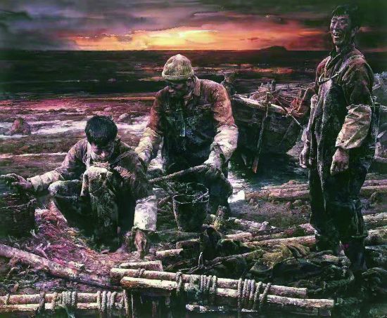 其次表現在格局見大,今天的水彩從“習作”向“創作”、“微型”向“巨型”、“抒情”向“敘事”轉換的趨勢日益明顯,大有叫板“油老大”的勢頭。當今國內水彩畫中出現了許多頗具史詩感的作品,例如由王紹波創作的水彩畫《漁歌》曾獲得第十屆全國美展金獎,畫家用水彩的方式表達了一種宏大的、雄健的情緒,改變了水彩畫是“小畫種”的傳統認知。格局見大又著重表現在以下四個方面:第一,題材突破。在主題性創作方面取得重大突破,大量表現重大歷史題材和現實生活,極大地拓展了水彩藝術的題材領域和表現范圍;第二,創作主導。以謹嚴的構思整飭筆下形象,將技巧、手法、語言形式或風格樣式導向特定思想主題表現的創作性,日益成為影響水彩藝術走向的主導方面,改變了以對景寫生創作的傳統格局。第三,塑造力強化。比之于油畫,原本非水彩之長的塑造力,即透入神情質感、絲絲入扣的塑造性刻畫,包括對人物、景物、器物形象深入細微的刻畫,以及大場景的恢宏性駕馭,在水彩畫創作上有了顯著加強。例如第九屆全國美展金獎水彩作品由陳海寧創作的《和諧的記憶》,在塑造性刻畫方面功力見長,暗含了水彩創作的整體發展趨勢。第四,風格形式多樣化。幾乎整個藝術領域的所有風格樣式都有水彩介質的呈現,例如寫實、寫意、抽象或裝飾畫風,水彩畫風格面貌比較豐富。