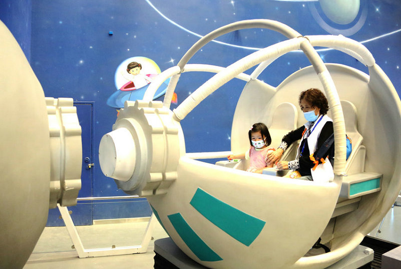 2021年5月19日,小朋友由家人陪同在中國科學技術館體驗“飛船對接運行” 。新華網發(劉廣生 攝于北京)