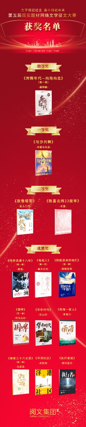 5月25日,由上海市新聞出版局支持,閱文集團主辦的第五屆現實題材網絡文學征文大賽頒獎儀式在滬舉辦。大賽共評選出十三部獲獎作品,聚焦改革開放后青年群體成長奮斗的《奔騰年代——向南向北》獲特等獎,講述中國科技出海故事的《與沙共舞》獲一等獎。