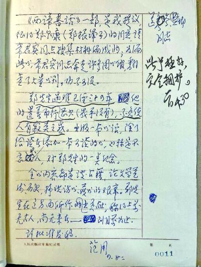 《晦庵書話》之后,又有鄭振鐸的《西諦書話》。三聯書店留存下來的這本書的書稿檔案中的“審讀意見”是范用親自寫的: