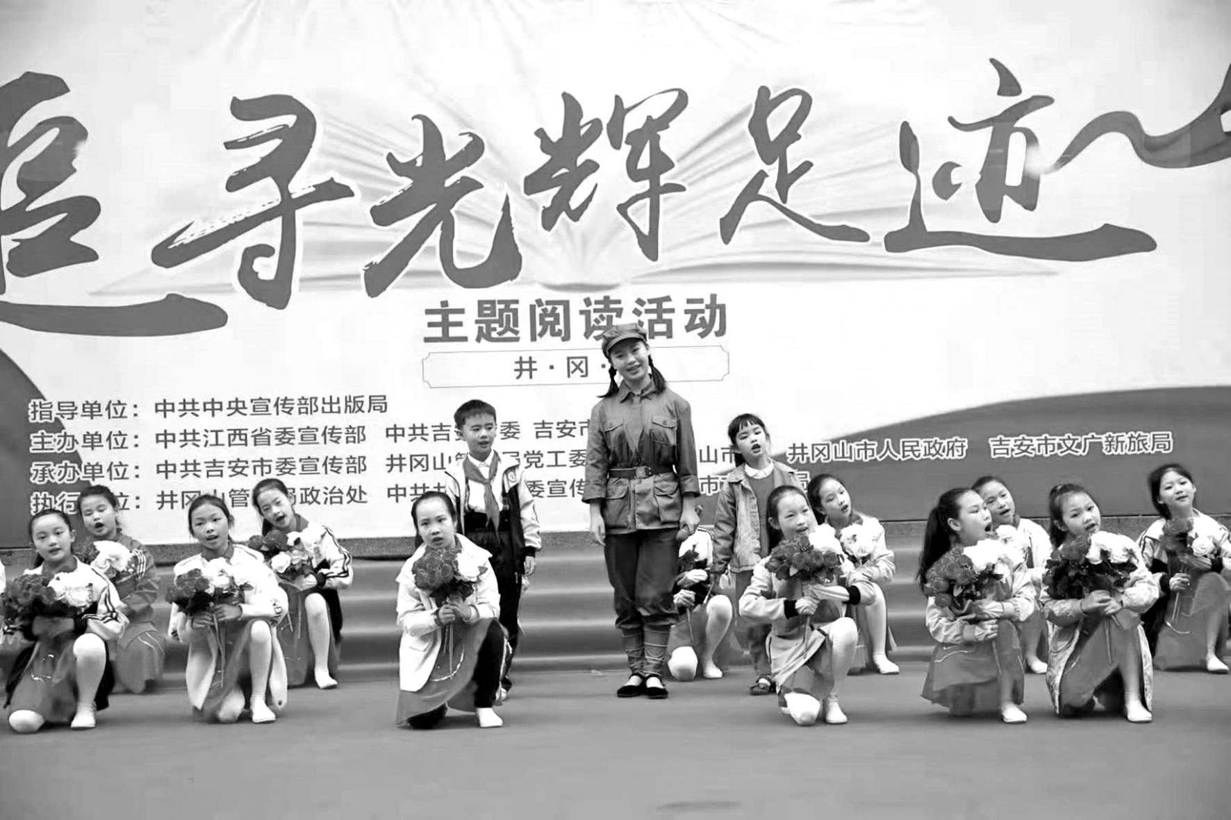 ▲ 井岡山實驗小學的學生在“追尋光輝足跡”主題閱讀活動啟動儀式上表演歌舞《唱支山歌給黨聽》