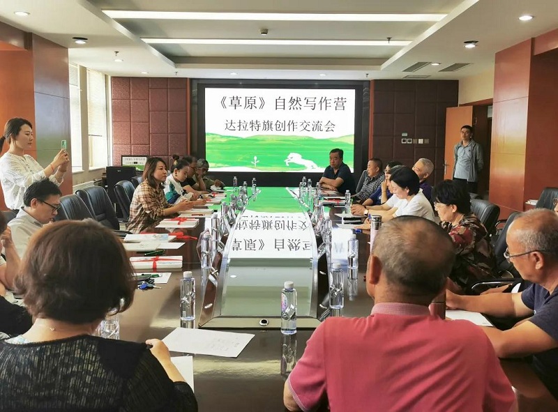 當日下午,自然寫作營的作家與達拉特旗本土作家共同走進興達陽光集團,參觀了企業黨建館,回顧黨的光輝歷程,接受了一次生動的黨史教育。之后與達旗本土作家們進行座談,就自然寫作的理解、創作感受等展開交流。座談中,《草原》主編及編輯表示將一如既往地關注基層作者,加大對基層作者的扶持力度,希望大家以此次自然寫作營為契機,走進廣袤的自然,從自然與生活中汲取文學創作營養,多出精品。會上,內蒙古文學雜志社與達旗文聯互贈了《草原》雜志和《長河》雜志。