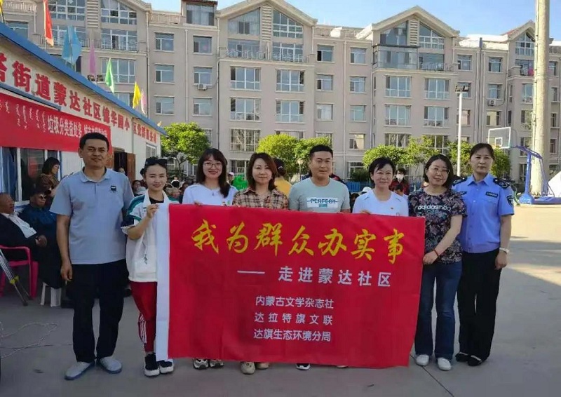 會后,自然寫作營的作家們與達拉特旗本土作家來到達拉特旗白塔街道蒙達社區錦華園小區,在世界環境日即將到來之際,開展了“我為群眾辦實事——走進蒙達社區”公益活動,為小區居民講解垃圾分類知識,并對小區的垃圾進行了清理。