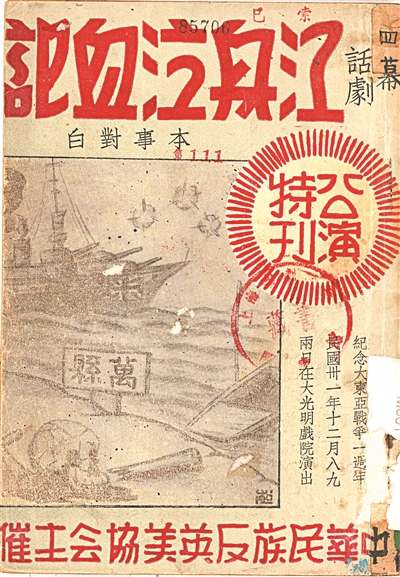 他所收集來的演出說明書中,有些劇目對當時的歷史和戲劇都提供了珍貴的研究價值。比如《怒吼吧!中國》是上世紀30年代左翼戲劇的一部重要作品,由蘇聯詩人特力雅可夫根據英美軍艦在四川萬縣迫害中國百姓的真實事件改編。他以詩的形式寫作,后由上海戲劇協會搬上舞臺。但在日軍占領上海后,當局為動員民眾將其改編為《江舟泣血記》?!督燮洝费莩稣f明書顯示,該劇曾在大光明戲院組織了演出。上海解放后,人民政府組織的第一次大規模演出也正是此劇,演出地點在文化廣場。