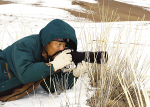 記不清是第幾次了,在冬季零下20多攝氏度的青海湖畔,葛玉修在中華對角羚經常出沒的沙丘與草叢連接處潛伏。長時間爬冰臥雪,讓他的腿部關節陣陣刺痛。相機取景框上,呼出的熱氣轉瞬凝霜。功夫不負有心人,葛玉修終于拍到中華對角羚近距離清晰的頭部特寫照片。后來,這張難得的中華對角羚“靚照”幾乎成了葛玉修的名片。他將這張照片做成帶有說明的宣傳卡,發送給專家、學者、朋友、學生,得到社會各界的認可和肯定,“中華對角羚”這個名字也越叫越響。
