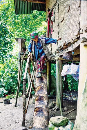 獨龍族傳統住房分為木壘房和篾笆房兩種,為了防潮、防霉、防野獸而離地建蓋。房屋與地面相連的獨木梯用一根圓木鑿出一個個臺階制成。攝于2013年。 楊學飛攝