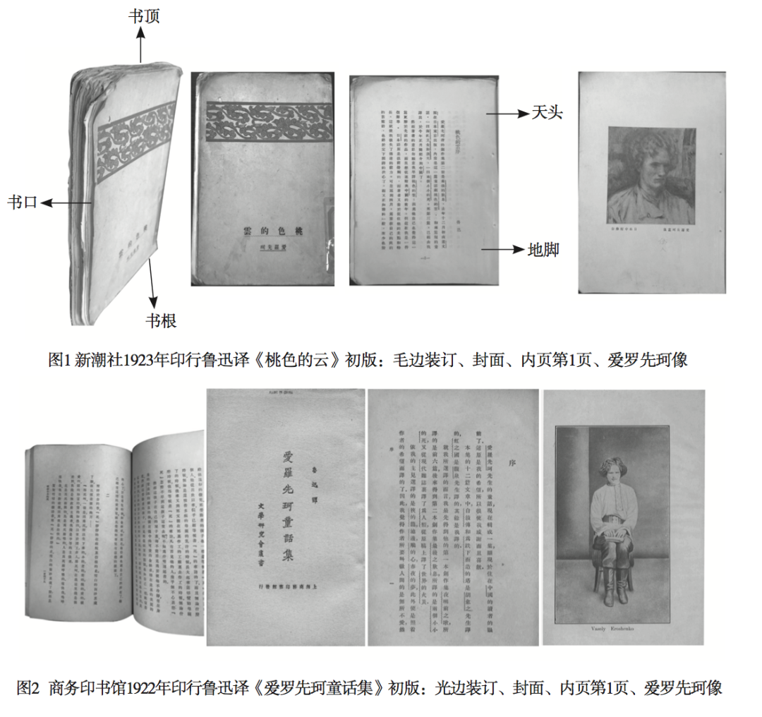 要達到最佳效果,“新潮社文藝叢書”毛邊本依靠的不僅是裝幀與版式設計,同樣還需要令設計得以實現的物質與技術基礎??梢哉f,“新潮社文藝叢書”利用了其時最精良的機械印刷條件。在紙墨方面,周氏兄弟留日時便已注意到歐式及日式毛邊本的封面多用皮革燙金或布面軟精裝,內頁墨勻紙潔,編印《域外小說集》時,就曾盡力模擬其質感,用仿呢布質地的厚羅紗紙做書面,用“上好洋紙”印本文,自謂“印的特別考究”6?!靶鲁鄙缥乃噮矔毖匾u此制,封面用仿布質的重磅木造紙或布紋紙,插圖用銅版紙,內文不再采用國內通行的質地脆弱、易氧化發黃的低價白報紙,而全部使用潔白光滑、不易變色、印字均勻的較高價道林紙。在印刷方面,“叢書”拼貼式地采用了其時最新穎的印刷技術。在同北京各印廠充分商討價格、理解技術后,李小峰等幾個新潮社員選定了京華印書局。作為商務印書館在北京設立的印刷所,1921年京華印書局大增設備后,躍升為北京30多處印廠中規模最大,技術最新,制版最精也是價格最昂貴的一個7。而魯迅為精益求精,又委托商務印書館上??倧S制三色版《桃色的云》作者像8。這里不妨與1922年商務印書館出版《愛羅先珂童話集》做一比較,同為愛羅先珂作品翻譯集,商務版作者像即為單色版照片,這是當時文集插圖的標配,三色版雖然清晰度高,但成本較單色或普通鋅版高出三倍至四倍,多用于畫冊、票鈔等,此前很少用于文集(《桃色的云》與《愛羅先珂童話集》形制對比見圖1、圖2)。