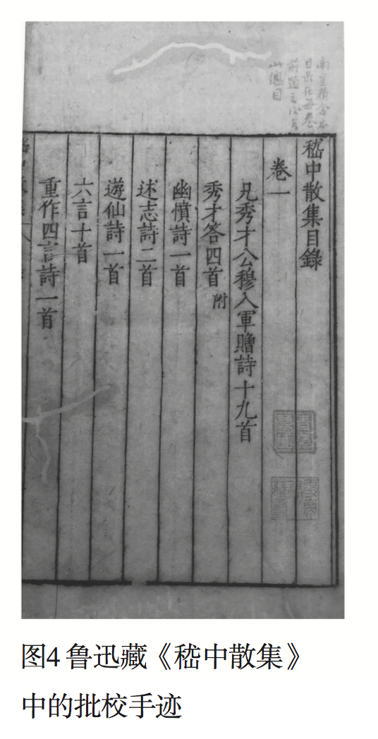 魯迅對《嵇康集》輯校甚精,此為魯迅所使用的底本之一,其??狈礊樵趦软撎祛^以朱筆批注。冊頁見《圖4:魯迅藏〈嵇中散集〉中的批校頁》,圖像轉自北京魯迅博物館編、韋力撰《魯迅藏書志(古籍之部)》上,中華書局2016年版,彩頁第8頁。
