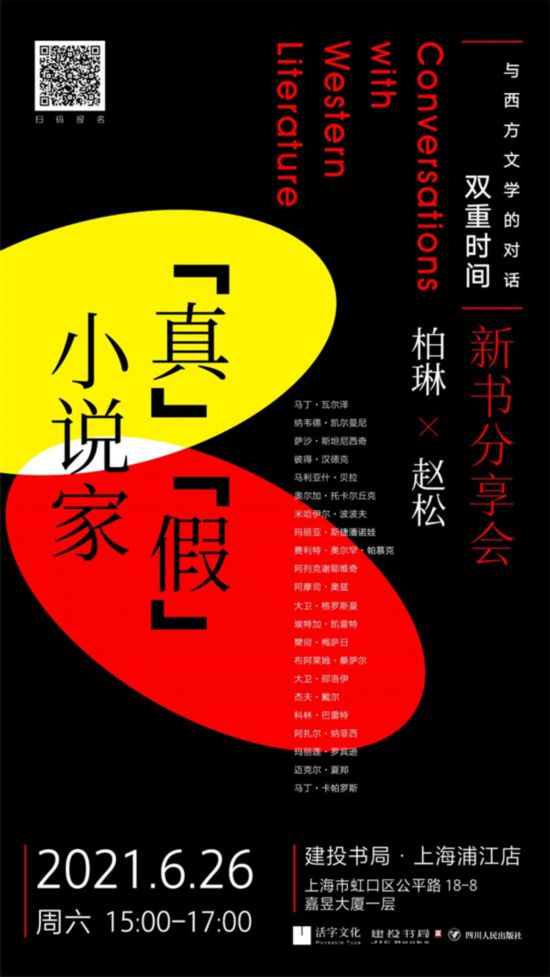 在《雙重時間》里,柏琳向數十位蜚聲當代世界文壇的作家們發問,卻不只跟他們談文學,還時?!白呱竦缴鐣栴}和道德議題上去”。她不只關注作家們的“作家”身份,也為讀者呈現他們作為人文學者、調查記者、批評家乃至政治活動參與者等多元的面貌,以及通過這些面貌所呈現出來的,作家們對于世界的看法。而對于趙松來說,“小說”本身就包含著無限的可能。在這個世界里,他是“建筑師”,不斷嘗試用文字構筑新的現實;也是“化學家”,觀察新鮮的文字組合所帶來的化學反應。6月26日下午,建投書局聯合活字文化,邀請采訪過很多小說家的柏琳和身為小說家的趙松做客建投書局·上海浦江店,以“真假小說家”為題展開對談。所謂“真”“假”,并非要為“作家”下一個定義,甚至也有可能,這場對話將讓這一身份變得更加混沌。