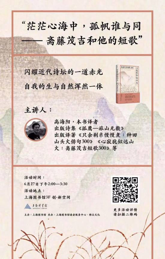 “短歌”始于公元六七世紀,是日本和歌眾多詩體中的一種。進入近代,許多歌人都嘗試對傳統和歌進行革新。齋藤茂吉正是短歌近代化的一個主要的領軍人物,后有“近代歌圣”之美譽。6月27日下午,齋藤茂吉首部中譯版短歌精選集《心寂猶似遠山火:齋藤茂吉短歌300》的譯者高海陽老師將做客上圖·悅讀匯分享會現場,細細解讀短歌和俳句、齋藤茂吉的人生,以及他所作的充滿感情而富有張力的短歌,帶領各位讀者一同欣賞品鑒閃耀日本近代詩壇的那一道赤光。