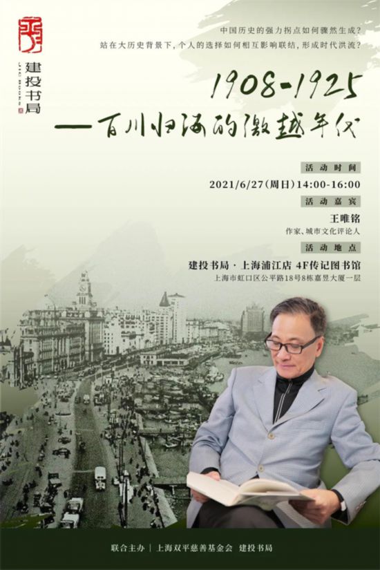 6月27日下午,建投書局聯合上海雙平慈善基金會邀請到作家、城市文化評論人王唯銘做客建投書局·上海浦江店,揭開1908至1925這一激越年代的歷史面貌,描繪變革時代背景下的人物群像,講述覺醒年代中的思潮演變。