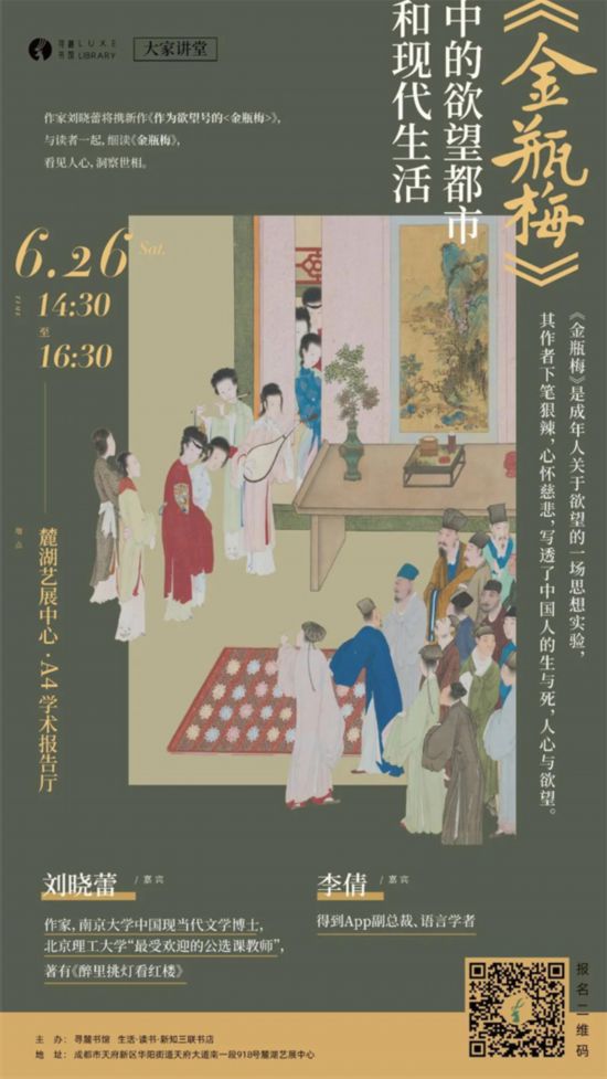 6月26日,作家劉曉蕾將攜新作《作為欲望號的<金瓶梅>》,做客尋麓,與得到副總裁、語言學者李倩一起,帶大家領略這部偉大的“凡人生死書”。歡迎讀者與劉曉蕾一起,細讀《金瓶梅》,看見人心,洞察世相;思考生與死,遠離恐懼,放下傲慢與偏見,獲得愛的能力。