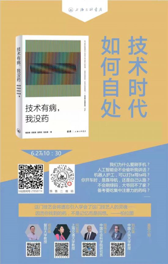 享用技術的后果,還是放棄技術的便利,生活在現代社會中的每個人,恐怕是沒有選擇權的——技術,代理了種種生活方式。楊慶峰、閆宏秀、段偉文、劉永謀這幾位技術哲學的專業人士愿意半正經半調侃地說道說道在技術的未來中的人。他們想了8個主題,寫了32篇半命題作文,表達各自相似或相反的觀點,互相角力。這組文章,一部分在“澎湃·思想市場”上刊發過,在網絡的互聯技術之下,擁有100萬+的點擊率?,F在幾位作者將這些文章匯成了一本小書。6月27日上午,在山腳下的書店(佛山路店),請聽他們的話題:技術時代與人類增強。