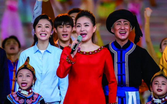 其二,表演區域的多點并舉與殊途同歸。此次演出大部分節目具有舞臺表演的去中心化特點。舞臺被分為前、中、后三個主要表演區域,還可以劃出左前、右前等區域。每個區域的表演在統一的主題下,又有一定程度的獨立性。因此,與一般綜藝性歌舞表演的寫意性“留白”不同,本次演出的大部分節目更多的是對寫實手法的運用,以舞臺的密與實,彰顯大氣磅礴的藝術風格。此外,舞臺后方的大屏幕通過歷史與當代重要事件的影像播放,與舞臺表演成為一體,形成了表演區域立體、多點的特征。這些區域在功能上殊途同歸,共同完成對不同主題的多元化建構。