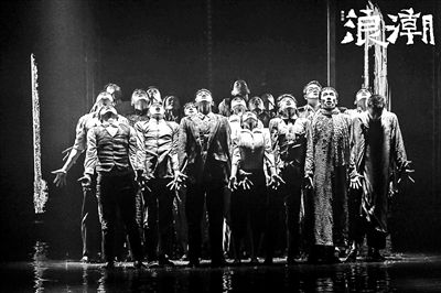 《浪潮》打造的首先是一個壓抑的世界,時而匯聚時而退去的水,與黑暗的氛圍一起構成了象征那個時代的意象。那是一個隨時可以掀起浪的黑暗空間,水的高光、水的不確定性讓整個舞臺充滿激情。但是,更多的時候舞臺上豎向的金屬框架和可升降的懸浮板象征著社會的壓抑。懸浮板因移位構成不同的環境,如濕漉漉的牢房、低矮逼仄的旅社、罷工前的訣別現場、京漢鐵路大罷工犧牲現場。它還可以是人物的心理空間,殷夫腦海中的哥哥,柔石心中的大先生和青年們,還有馮鏗與幼弟和妓女月仙的相遇都出現在那里。