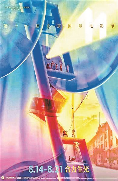 本屆電影節海報主題命名為“合力生光”,設計主體沿用了上一屆海報的核心元素——風車放映機。葉片轉動,燈光亮起,眼前的大幕正在徐徐拉開。風車之上,一隊電影工作者正在那里工作,導演、攝像、燈光、錄音、場記、化妝……而拉開的大幕后浮現出的是長城、北大紅樓和盤旋天上的北京雨燕。