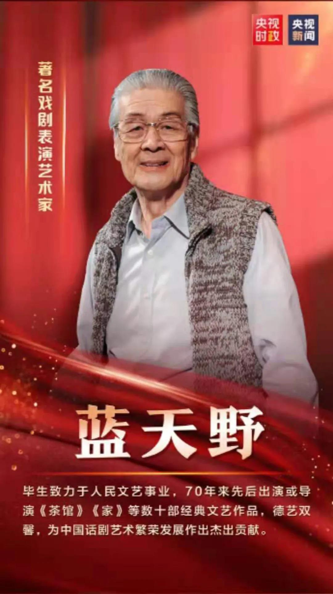 藍天野 漢族,1927年5月生,1945年9月入黨,河北饒陽人,北京人民藝術劇院演員、導演。將一生奉獻給人民文藝事業。青年時代參加革命,從事進步文藝活動。解放后,出演或導演《蛻變》《茶館》《家》等數十部優秀文藝作品,塑造眾多經典人物形象。傳承藝術藝德,發掘和培養一大批文藝界領軍人才,為中國話劇藝術繁榮發展作出重大貢獻。榮獲“全國優秀共產黨員”稱號和“中國戲劇獎·終身成就獎”等。