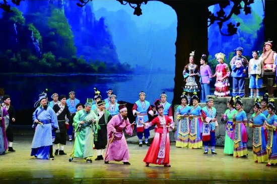 四、“劉三姐”是中國戲曲體系持續延展并凝結而成的國家形象、民族聲音?!皠⑷恪笔侵袊酥潦澜绻蚕淼奈幕?,從彩調劇到電影,再到多個藝術樣式,劉三姐的形象與題材已經在時代變遷中具有了超越現實的符號象征意味,已經成了用優美的歌唱和善良人性來傳達生活理想的載體。在經典的《劉三姐》舞臺藝術高峰之上,廣西壯族自治區戲劇院通過《新劉三姐》的創作,凸顯“劉三姐”文化對于當代生活和新時代理想的涵攝與延展。今天舞臺上的“新”,當然是保持戲曲本體而進行的時代生活再現,那種嶺南農村、民族族群的現實狀態最容易像今天眾多的現實題材創作那樣,流于一般性的政策圖解,但是《新劉三姐》卻盡量避開這種創作誤區,依然用歌唱的美、山歌的美、人性的美,來審視八桂大地這塊文化空間中人們的去留與生活。山水依然,而游子回歸,劇作中主人公最終走向的是中國人文的情感故園與精神駐地。這是該劇迥異于當前現實題材創作的所在?!缎聞⑷恪穼敶鐣钪械闹T多重大現象,例如新農村建設、城市創業等等,全部融匯成現代青年男女對于真實感情的表達,用情感的推移來呈現生活的變奏、精神的蛻變和生命的升華,這也印證了鄉土戲曲“以一國之事系一人之本”的文化根本要義。因此,這部作品推崇情感表達,張揚人性美好,肯定草根立場,表達詩性人生,崇尚民族共同意識,彰顯國家現代立場,形成與眾不同的戲曲舞臺面貌,以優雅的藝術化、輕松的娛樂化來建構現代舞臺,成為追步《劉三姐》藝術宗旨的又一部跟進之作,也是“劉三姐”文化實現現代轉化的又一個精彩個案。該劇當然更應該用《劉三姐》60年的創作經驗和傳承規律,不斷打磨,讓人能夠看到企及經典的發展空間。