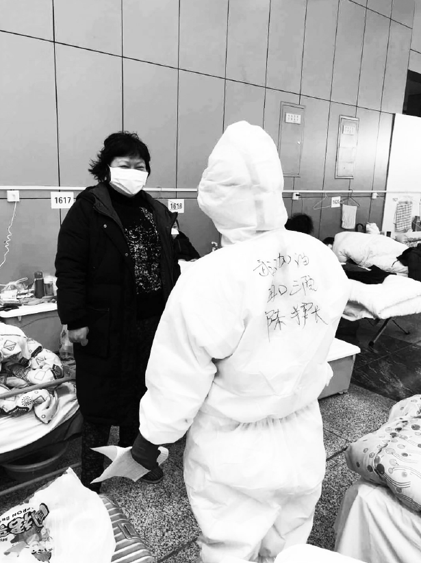 咽拭子采集是一項危險的工作,棉簽帶來的不適感讓患者干嘔、咳嗽,肉眼可見的飛沫裹挾著病毒撲面而來……在江漢方艙醫院,這樣的操作,我主動承擔了下來,說實話,不怕是假的,何況我本身就患有喘息性氣管炎。但突如其來的疫情,正威脅到每一個人,如果疫情不能得到控制,我覺得下一個受害者就是我們身邊的人。為了守護他們,我必須挺身而出。咽拭子采樣、病人檢查、生活物資搬運、整理錄入病例資料等,作為小組的領隊,在一個特殊的環境中,我要時時檢查落實,保證患者放心。防護服、N95口罩、護目鏡、手套、腳套,這就是我們與新冠病毒“戰斗”的裝備。最難處理的就是護目鏡上的霧氣,偶然的機會,我發現把衛生墊貼在N95口罩里面可有效吸收霧氣,就在醫療隊內普及,得到了大家的認可。有一次,隊友因為護目鏡看不清楚,抽血看不到病人血管,我就貼著衛生墊,深吸一口氣屏住呼吸,迅速低頭消毒、插針、抽血一氣呵成,贏得了病人連聲道謝。很多事情,只有經歷過,才知道自己內心可以多強大。在武漢,我們救治患者,患者也在保護著我們。在抗擊疫情的日子里,我和患者也成為了親人。