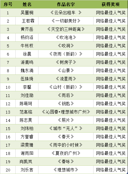首屆珠江兒童詩歌獎以“理想城市”“美好回憶”“嶺南風物”為主題,廣泛向國內16歲以內的少年兒童征集現代詩和舊體詩。截止2021年6月1日,共收到參賽作品700多件。經評委初評,共有170個作品進入復選(網絡票選)。最終,結合網絡票選結果和評委意見,終評出金獎20名、銀獎50名、銅獎80名、網絡最佳人氣獎20名。