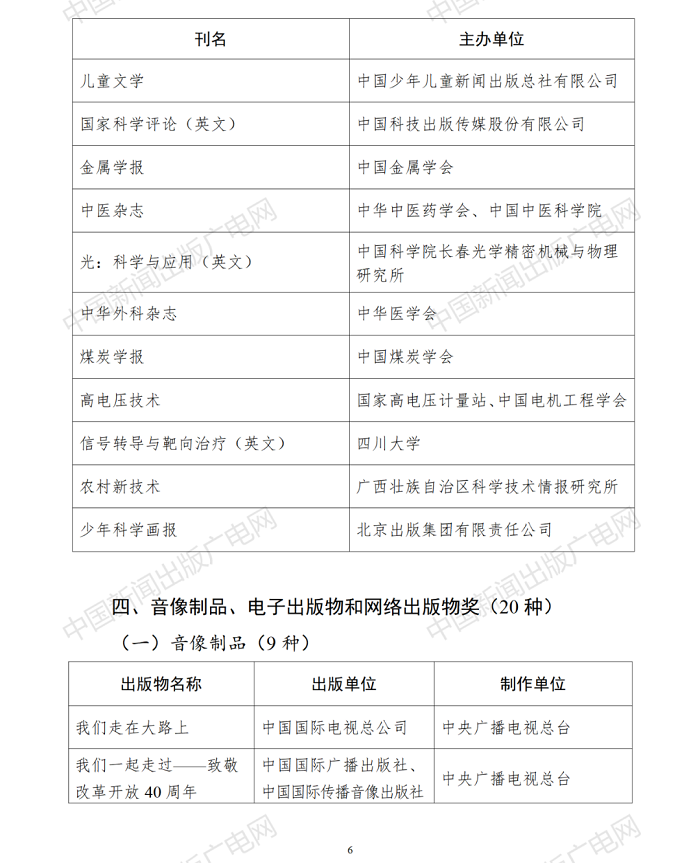 為深入學習宣傳貫徹習近平新時代中國特色社會主義思想,全面落實黨的十九大和十九屆二中、三中、四中、五中全會精神,促進出版業高質量發展,推進社會主義文化強國建設,根據《中國出版政府獎評獎章程》規定,國家新聞出版署組織開展第五屆中國出版政府獎評選表彰活動。經嚴格評選,《習近平談治國理政》(第一、二、三卷)等3種圖書獲榮譽獎,《習近平新時代中國特色社會主義思想學習綱要》等60種圖書獲圖書獎,《中共黨史研究》等20種期刊獲期刊獎,《我們走在大路上》等20種作品獲音像制品、電子出版物和網絡出版物獎,《慶祝中華人民共和國成立70周年盛典圖冊》等10種作品獲印刷復制獎,《嘉卉——百年中國植物科學畫》等10種作品獲裝幀設計獎;人民出版社等50家單位獲先進出版單位獎;高克勤等69名個人獲優秀出版人物獎。此外,237種優秀出版物獲提名獎。