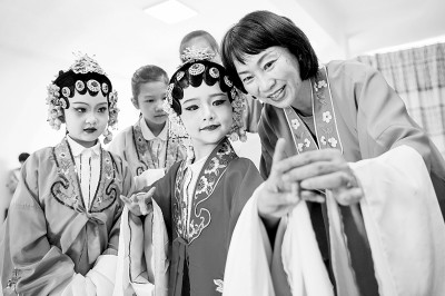 趙洪說:“有的孩子開始要學戲就是因為服裝、化裝好看,逐漸就會體會到更深層的美。從這個意義講,韻律操、學臉譜都是很好的普及形式?!?/p>