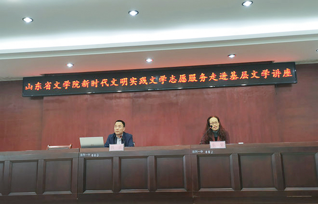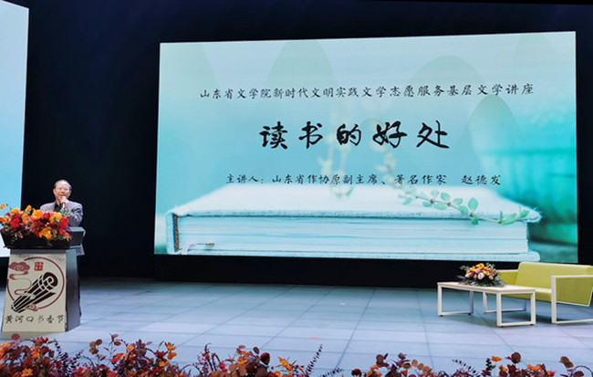本次活動邀請到了山東省作家協會原副主席、著名作家趙德發,山東省作家協會副主席、著名作家鐵流作為志愿者代表,在墾利區分別為基層作家和文學愛好者以及墾利一中的部分同學們帶來了生動的文學講座。講座由山東省作家協會主席團成員、著名作家東紫主持。趙德發以“讀書的好處”為題,與現場文學愛好者分享了自己的讀書心得以及《經山?!穭撟鹘洑v。鐵流以“紅色經典依然具有強大的生命力”為題,與同學們分享了許多紅色經典故事,通過故事讓同學們體會思考我們現在生活的來之不易。講座結束后,文學院進行了關于新時代文明實踐活動以及培訓工作的專題調研,調研活動取得了預期效果,基層作家提出多條意見建議,對下一步工作具有較強的參考意義。