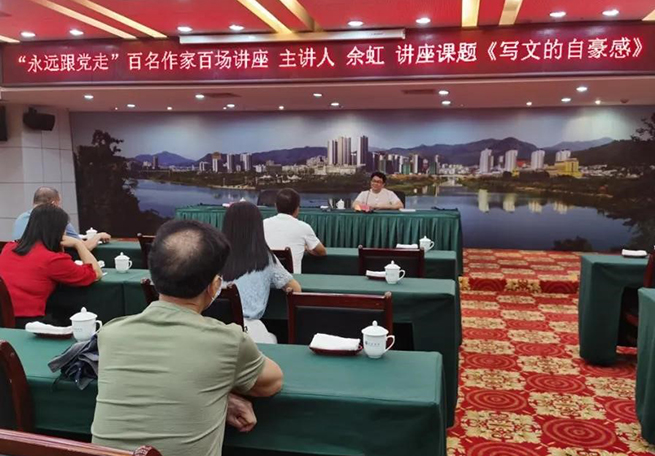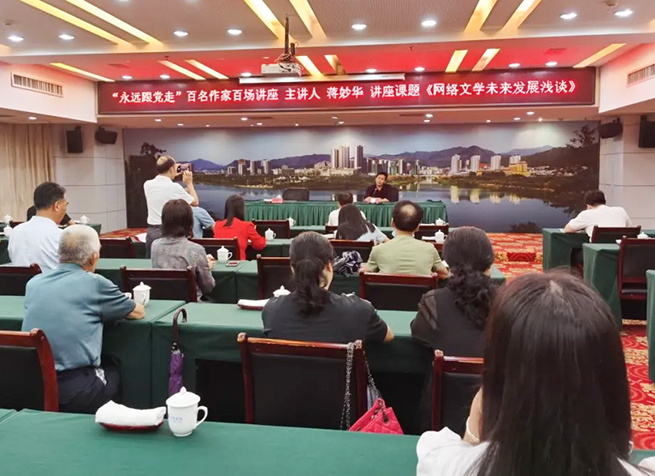 6月24日,由福建省文聯、福建省作協、福建省文評協、福建省文聯文藝志愿團文學分團、福建省文聯文藝志愿團文評協分團、三明市文聯主辦,福建省作協網絡文學專委會承辦,三明市作協、三明市文藝院、將樂縣文聯、將樂縣作協協辦的“永遠跟黨走·百名作家百場講座”活動在將樂縣舉行。此次活動邀請了中國作家協會會員、將樂籍網絡作家余虹,福建省作協會員、網絡作家蔣妙華前來授課,將樂縣作協主席肖勝龍主持講座。來自將樂縣的文學愛好者聆聽了講座。