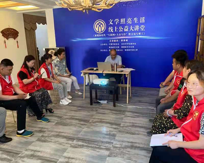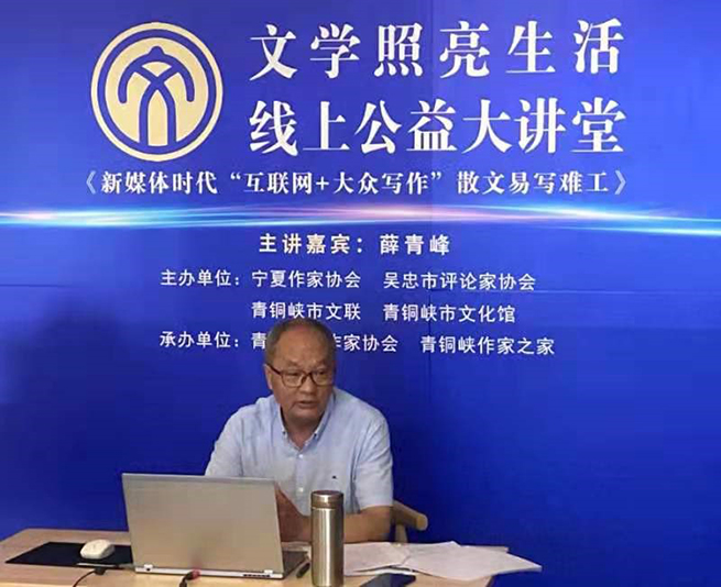 6月27日上午,為迎接中國共產黨100歲華誕,貫徹落實習近平總書記關于文藝工作的重要論述,發揮文藝工作者以文化人、以文育人的優勢,由寧夏作家協會、吳忠市文藝評論家協會、青銅峽市文聯、青銅峽市文化館主辦,青銅峽市作家協會、青銅峽作家之家創研培訓基地承辦的“文學照亮生活”線上線下公益大講堂在青銅峽作家之家成功舉辦。寧夏作家協會副秘書長張濤主持并致辭。國家二級作家、寧夏理工學院副教授、石嘴山市文藝評論家協會主席薛青峰受邀擔任主講嘉賓。