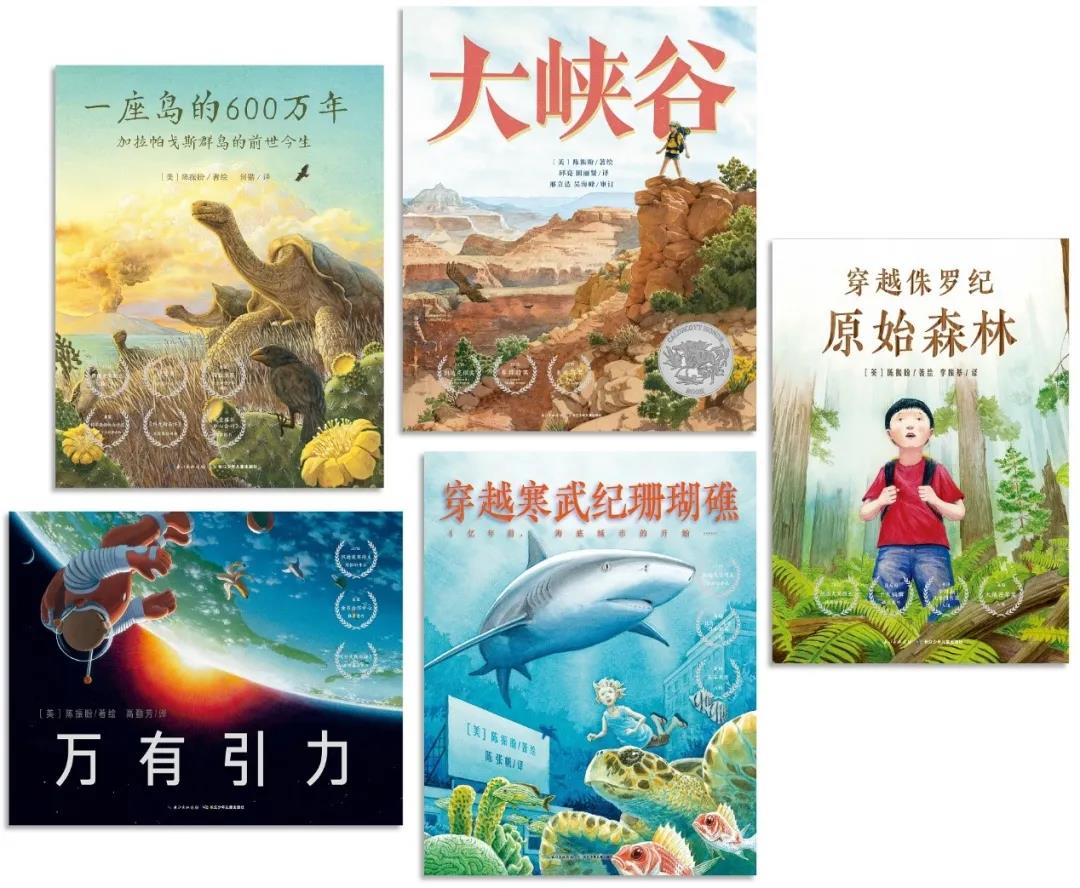 目前,國內已引進出版了陳振盼獨立著繪的五部科普作品①,(見組圖1)每部均獲獎頗豐。其中,《大峽谷》(Grand Canyon)獲得2018年凱迪克銀獎、賽博特獎、奧比斯獎;《一座島的600萬年:加拉帕戈斯群島的前世今生》(Island:A Story of the Galápagos)獲得2013年獅鷲獎,并被美國《學校圖書館雜志》(School Library Journal)、《科克斯書評》(Kirkus Reviews)共同評為2012年度最佳圖書;《穿越寒武紀珊瑚礁》(Coral Reefs:A Journey Through an Aquatic World Full of Wonder)入圍美國矢車菊獎;《穿越侏羅紀原始森林》(Redwoods)獲得亞馬遜十大編輯精選童書?!度f有引力》(Gravity)也非常出色,獲得美國童書中心推薦和《科克斯書評》年度最佳圖書??梢哉f,陳振盼是當之無愧的童書界“寶藏男孩”,據說其創作初衷是“讓紐約的孩子也能看到原始森林”。他做到了,如今,城市里的孩子能通過陳振盼的作品看見世界上真實存在的奇跡,看見恢宏的想象力交織而成的絕妙作品。