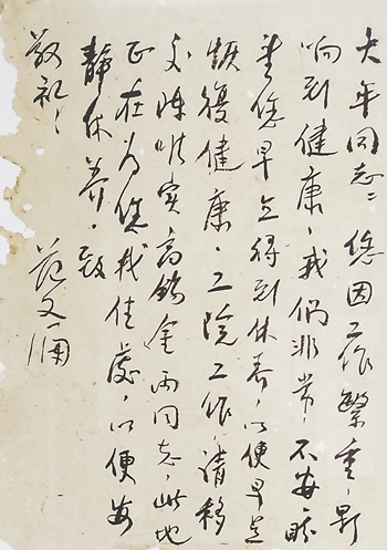 范文瀾故居陳列著范文瀾致劉大年的信函?!按竽晖荆耗蚬ぷ鞣敝?,影響到健康,我們非常不安,盼望您早點得到修養,以便早點恢復健康。工院工作,請移交陳唯實、高錫金兩同志,此地正在為您找住處,以便安靜修養。致敬禮范文瀾”。