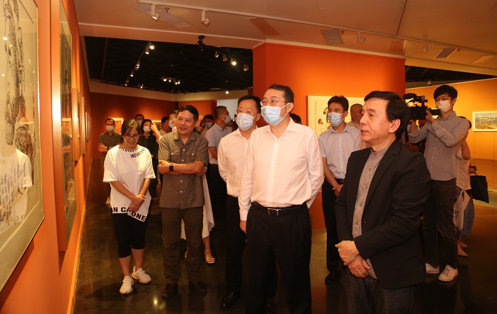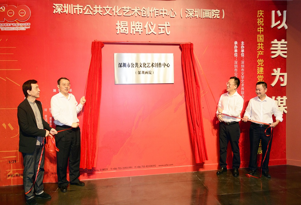 8月27日,筆架山北,銀湖水畔,滿山翠微掩映下的金湖一街36號格外熱鬧。深圳市公共文化藝術創作中心(深圳畫院)揭牌儀式在深圳畫院美術館舉行,深圳市委常委、宣傳部部長王強,市委宣傳部常務副部長陳金海,市文聯黨組書記、主席梁宇,市委黨史學習教育第五巡回指導組組長楊威共同為中心揭牌,并參觀了“以美為媒——慶祝中國共產黨建黨100周年藝術作品展”。