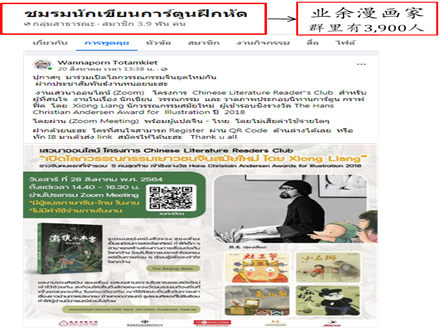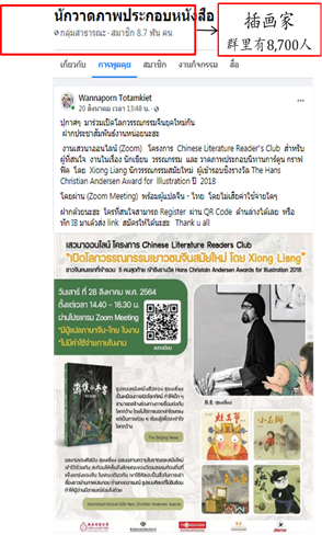 活動進行過程中,在線讀者紛紛留言,對熊亮的作品給予了高度評價,并希望熊亮的作品可以走進泰國,讓泰國讀者切身感受其中的神秘世界,促進中國童書走進海外市場?;顒右驳玫搅颂﹪妒澜缛請蟆贰秮喼奕請蟆返戎匾埫降臓幭鄨蟮?。同時,在Facebook等社交平臺上設立了多個粉絲群組,粉絲高達8600人。