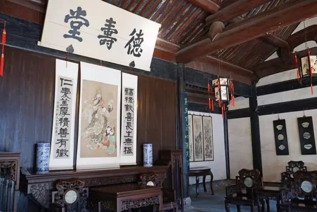 老臺門的廳堂是周氏族人的公共活動場所,以作喜慶、祝福和宴會賓客之用。廳堂正上方高懸一塊大匾“德壽堂”,兩旁柱子上有一副紅底黑字的楹聯:“品節詳明德性堅定 事理通達心氣和平”。