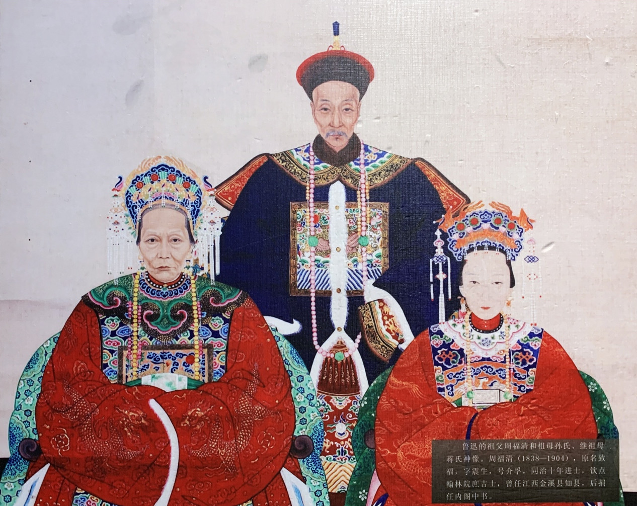 魯迅的祖父周福清(字介孚,1838-1904),同治十年進士,欽點翰林院庶吉士,曾任江西金溪縣知縣,后捐任內閣中書。后因科場案入獄。圖為紹興魯迅故居內魯迅祖父周福清和祖母孫氏、繼祖母蔣氏的畫像。