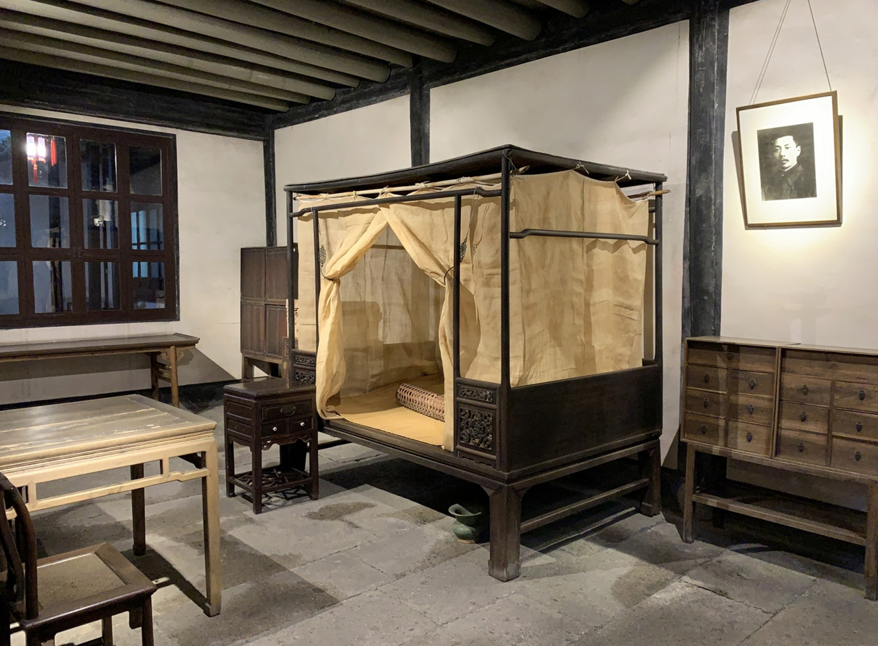 周家新臺門位于紹興城內東昌坊口,建于清嘉慶年間,是周氏家族三個臺門中建成時間最晚的一個。1881年9月25日,魯迅出生于此,并一直生活到18歲去南京求學之前。魯迅從日本留學歸國后曾在紹興府中學堂和山會初級師范學堂擔任教職,這一期間他也居住于此。魯迅常常在這里備課、寫作到深夜。他的第一篇文言小說《懷舊》就是在此寫成的。臥室里陳列著的一張鐵梨木床,系魯迅當年睡過的原物。圖為魯迅的臥室。