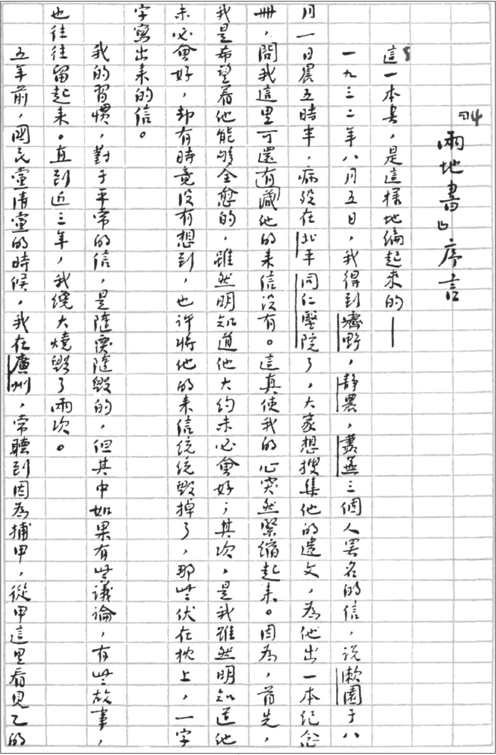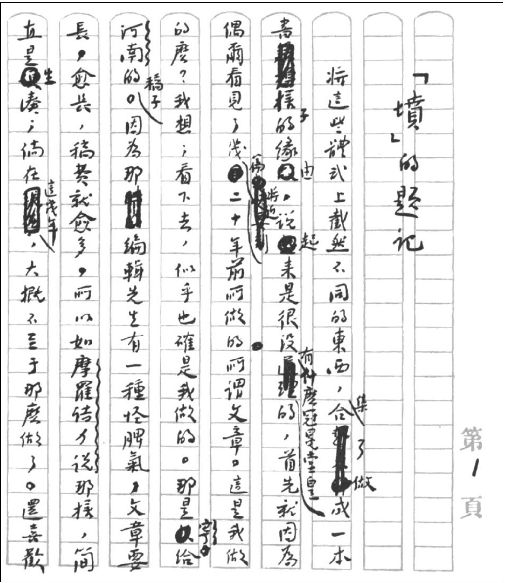 魯迅文稿的書寫大多用各類長方格稿紙,也有部分無格的稿紙。用帶格稿紙寫作時,基本一字一格,從無潦草。魯迅早期作品的手稿大都失散,現存文稿手跡只是全部創作的四分之一。上圖為1925年10月30日作的《<墳>的題記》,是現存魯迅最早文稿。其時魯迅在廈門,一個大風之夜,文中寫道,“雖然明知道過去已經過去,神魂是無法追躡的,但總不能那麼決絕,還想將糟粕收斂起來,造成一座小小的新墳,一面是埋藏,一面也是留戀?!?/p>