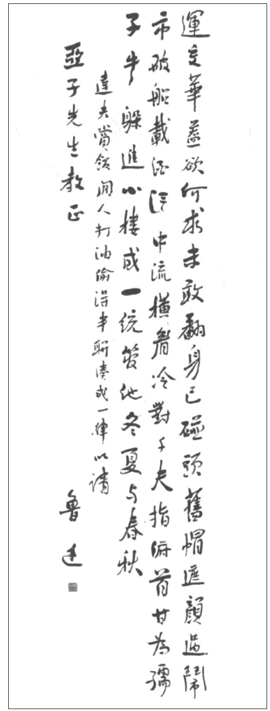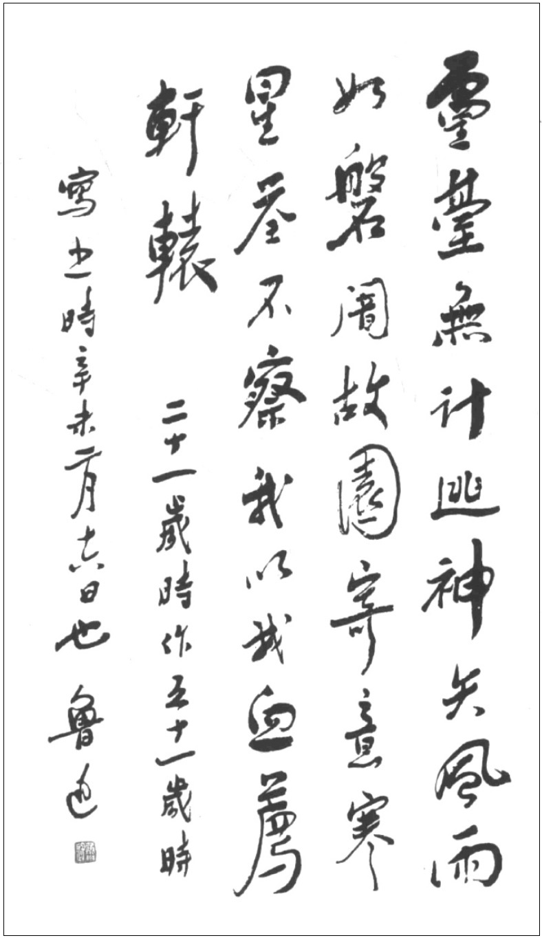 “靈臺無計逃神矢,風雨如磐暗故園。寄意寒星荃不察,我以我血薦軒轅。二十一歲時作,五十一歲時寫之,時辛未二月十六日也。魯迅?!保它c為編者所加)《自題小像》詩作于1903年,現存三幅,上圖為其中之一,是1933年魯迅重錄的。相比于其他文體的手跡,魯迅詩稿是更純粹意義上的書法作品。魯迅研究專家蕭振鳴對這幅字的書法藝術評析道,“豎寫四列,跋詞字號略小,字體寬博厚重,第一個‘靈’字引首,大有黑云壓城之勢,‘風雨’二字盡顯行書的灑脫,‘磐’字出筆沉穩,‘闇’‘園’二字圓轉處澀意濃重,遲緩有度,‘血’字具有強烈的感情色彩,力透紙背。通觀全篇,起筆沉穩,收筆少有出鋒,書法樸茂厚重,一氣呵成,具有強烈的視覺美感?!?/p>
