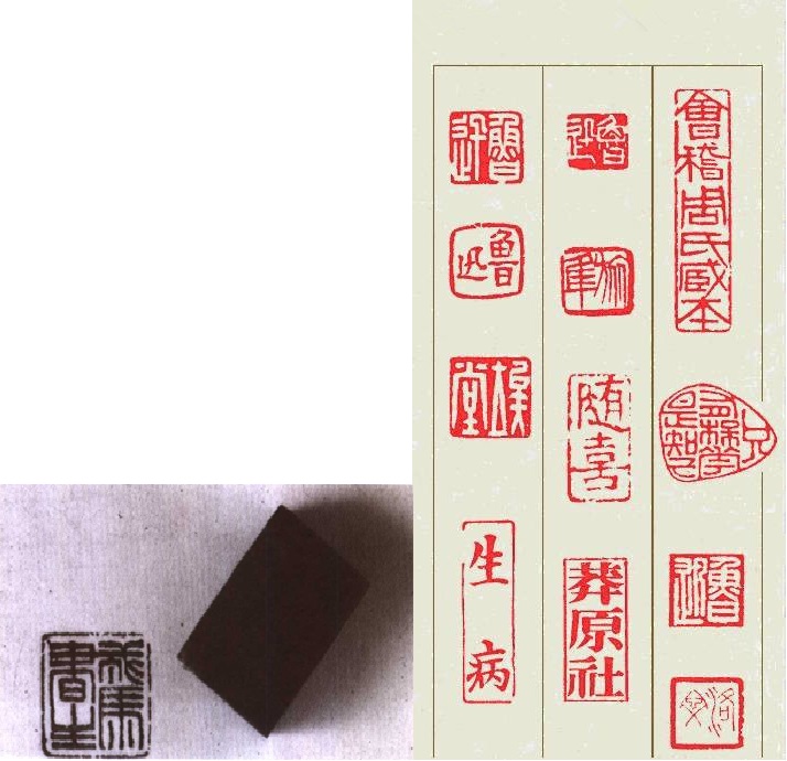 治印識印是中國文人的一大特征。魯迅叔父周芹候擅長篆刻,少年時耳濡目染下,魯迅也對刻印有過了解。在魯迅改定的《<蛻龕印存>序》中,他僅用四百余字就講解了印章的傳說、起源、發展和審美價值。南京求學時期,魯迅也曾自刻過“文章誤我”“戛劍生”“戎馬書生”等印。今僅存“戎馬書生”?。ㄉ献髨D:2.6cm×1.7cm×1.7cm?,F存北京魯迅博物館)。另有多枚名章、閑章為他人所贈(上右圖):其中友人陳師曾為魯迅刻印最多,“俟堂”(左欄第三)即為陳師曾刻??;“魯迅”(右欄第三)為許廣平1926年所贈,許廣平致魯迅信中寫道,“茲寄上圖章一個,夾在絨背心內,但外面則寫圍巾一條。你打開時小心些,圖章落地易碎的?!贝卧禄匦胖?,魯迅表示收到,并稱“印章很好”;“魯迅”(左欄第一)是1931年6月吳德光刻,此印曾廣泛用作1930年代出版的魯迅著作版權印花,另外,著名的詩稿《答客誚》(無情未必真豪杰)上也鈐印此章。